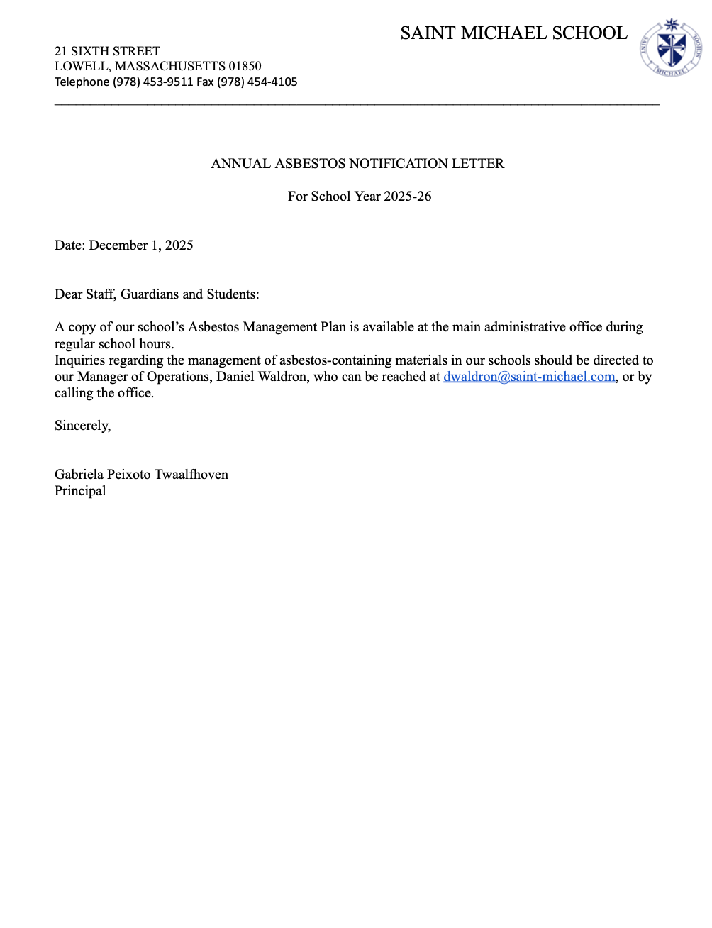 "Saint Michael School admits students of any race, color, national and ethnic origin to all the rights, privileges, programs and activities generally accorded or made available to students at the school. It does not discriminate on the basis of race, color, national and ethnic origin in administration of its educational policies, admissions policies, scholarship and loan programs, and athletic and other school-administered programs.”